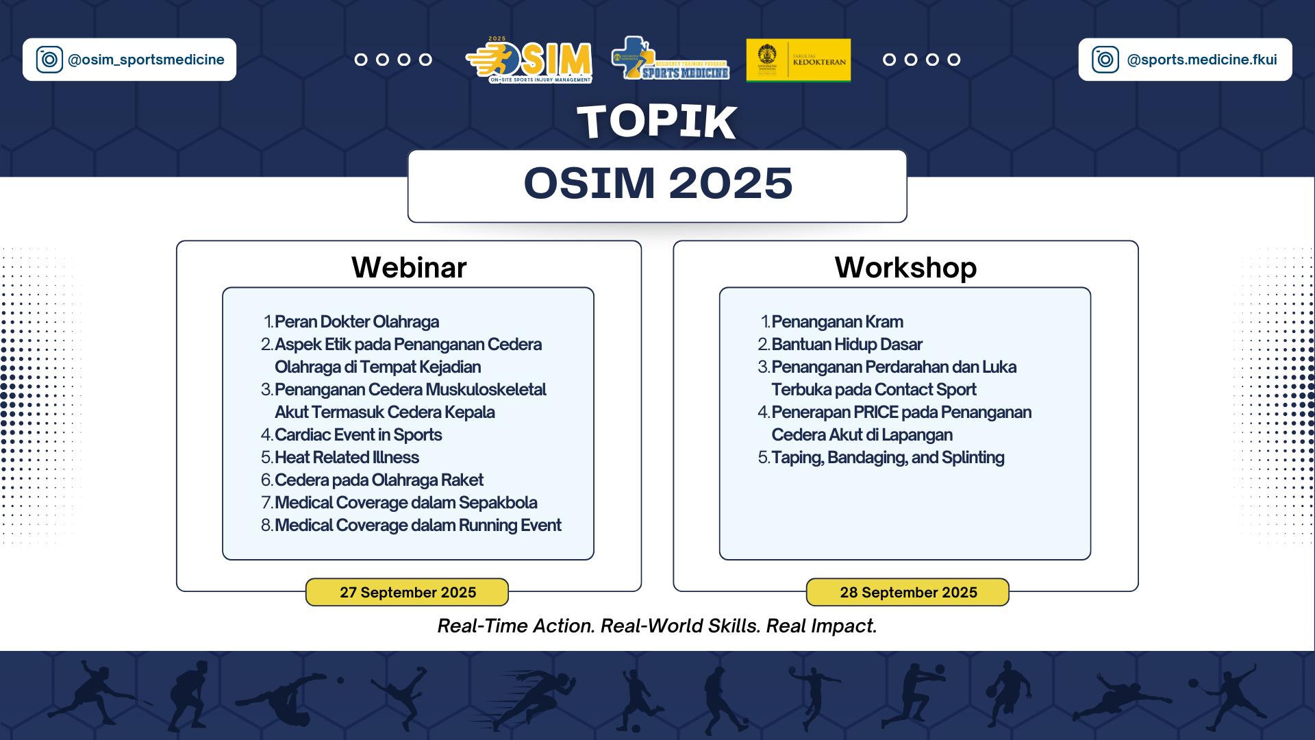 OSIM (On-Site Sports Injury Management) merupakan inisiatif edukatif tahunan yang diselenggarakan oleh Program Studi Ilmu Kedokteran Olahraga, Departemen Ilmu Kedokteran Komunitas, Fakultas Kedokteran Universitas Indonesia. Kegiatan ini dirancang sebagai wadah pembelajaran dan pelatihan bagi tenaga kesehatan (dokter umum, dokter spesialis, perawat, fisioterapis, dan tim bantuan medis mahasiswa kedokteran) maupun non tenaga kesehatan yang terlibat dalam dunia olahraga, dengan fokus pada penanganan cedera olahraga secara cepat, tepat, dan aman di lapangan.